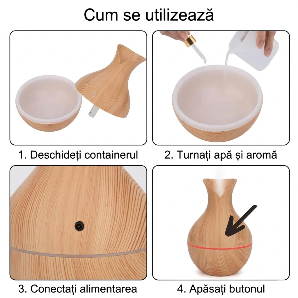 Difuzor de aromaterapie cu ultrasunete și umidificator cu LED, rezervor 130 ml. Vaporizează uleiurile esențiale sub formă de vapori reci, purifică aerul, umidifică încăperea și creează o atmosferă relaxantă. Sigur pentru întreaga familie, inclusiv copii.